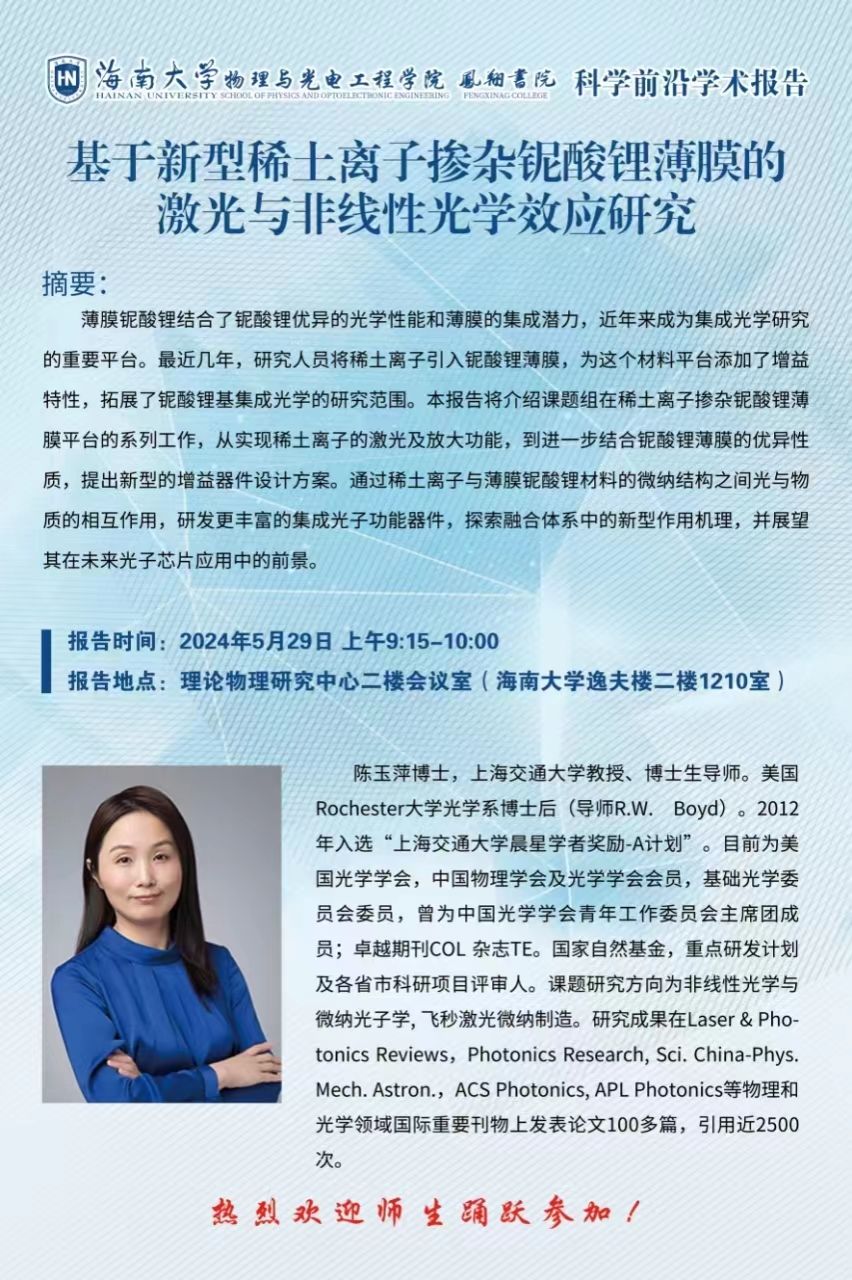 科学前沿学术报告(二十七):基于新型稀土离子掺杂铌酸锂薄膜的激光与非线性光学效应研究